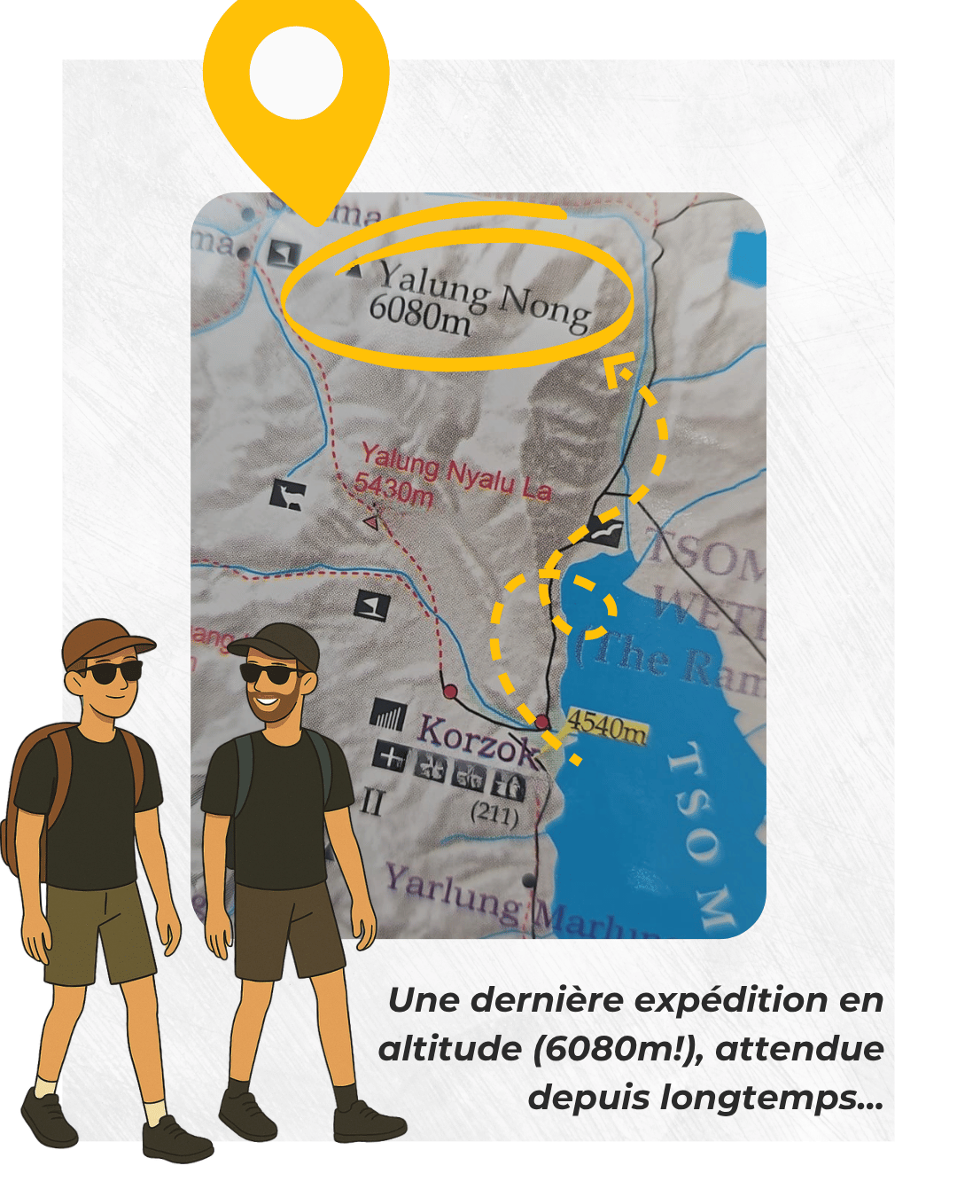 Depuis longtemps, Maurin rêvait de gravir le Yalung Nong (6080 m), un sommet qu’il n’avait jamais pu tenter il y a vingt ans. Après discussion avec Skaldan et le guide, un nouveau plan s’est dessiné : partir depuis Korzok (4540 m), y passer une nuit d’acclimatation chez l’habitant, puis tenter l’ascension en une seule journée, très tôt le lendemain matin.