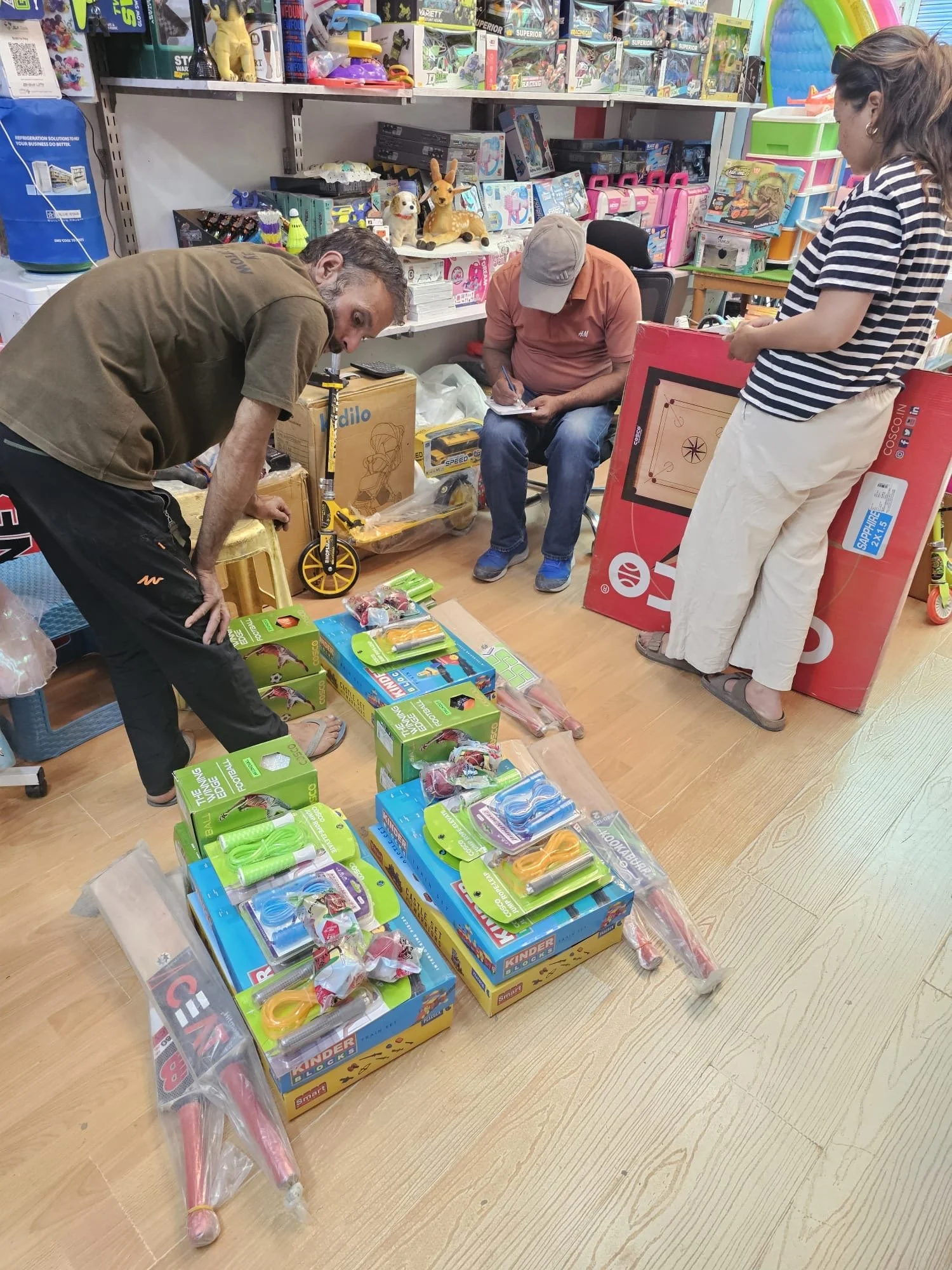 Parmi les missions principales : acheter des jeux et fournitures pour les enfants des villages isolés : cordes à sauter, ballons de foot, jeux de construction, matériel de criquet… Ces éléments viennent compléter les chaussures et chaussettes déjà prévues pour la distribution. Ils ont également acheté des provisions : pâtes, oeufs, légumes, farine, et graines pour les animaux, autant de choses difficiles à trouver dans les zones reculées. Tout sera acheminé par leurs soins.